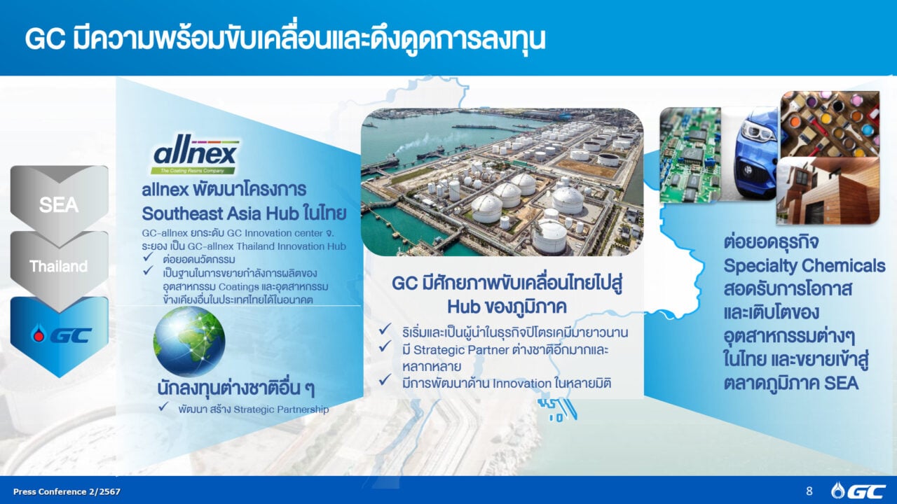 ทั้งนี้โดยสรุปแนวทางการสร้างการเติบโตของจีซี ช่วงครึ่งหลังปี 67 เน้น 2 ด้านคือ 1. ผลิตภัณฑ์เคมีภัณฑ์มูลค่าสูง และคาร์บอนต่ำ ด้วยการต่อยอดธุรกิจผ่านออลเน็กซ์ ตามแนวทางกลยุทธ์การปรับพอร์ตธุรกิจของ จีซีให้มีสัดส่วนรายได้เพิ่มขึ้นจากธุรกิจผลิตภัณฑ์มูลค่าสูง จำเป็นต้องอาศัยนวัตกรรมและเทคโนโลยีการผลิตขั้นสูง