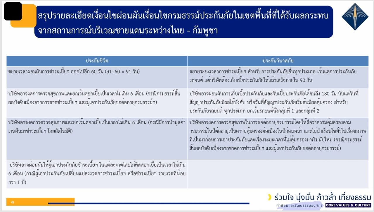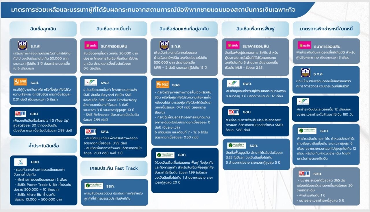 มาตรการช่วยเหลือและบรรเทาผู้ที่ได้รับผลกระทบจากสถานการณ์ข้อพิพาทชายแดนของสถาบันการเงินเฉพาะกิจที่มีการออกมาตรการพักชำระหนี้ มาตรการสินเชื่อพิเศษเพื่อฟื้นฟูภายหลังได้รับผลกระทบ สินเชื่ออัตราดอกเบี้ยต่ำ และสินเชื่อเพื่อการฟื้นฟที่อยู่อาศัย