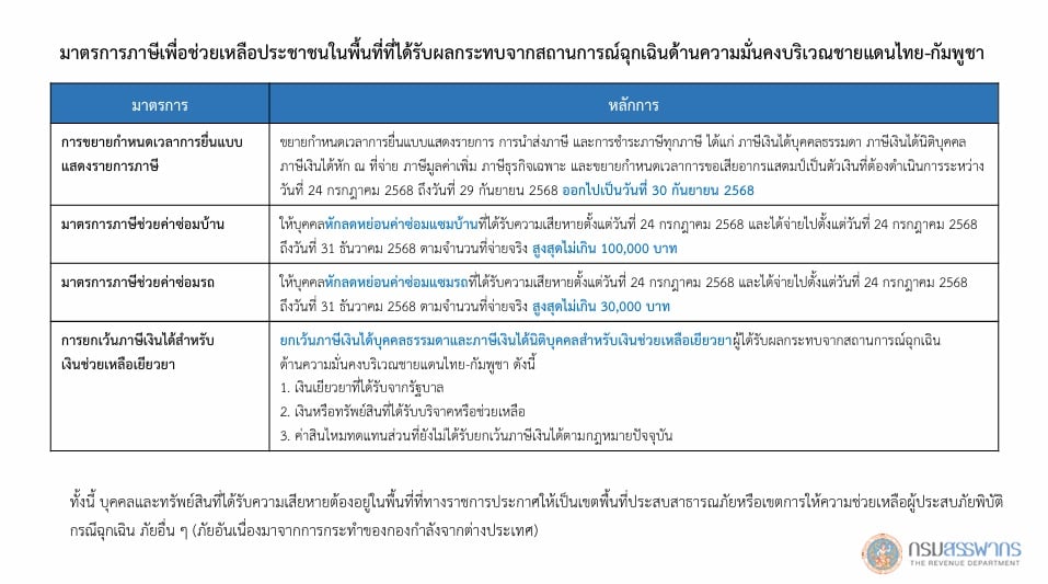 การสรุปทำความเข้าใจในมาตรการช่วยเหลือและบรรเทาผู้ที่ได้รับผลกระทบฯ ของกรมสรรพากร ทั้งมาตรการภาษีเพื่อช่วยเหลือประชาชนและผู้ประกอบการที่ได้รับผลกระทบ ที่ให้สิทธิประชาชนสามารถหักลดหย่อนค่าซ่อมแซมที่อยู่อาศัยจากเหตุการณ์ความเสียหายได้ตามจริงไม่เกิน 100,000 บาท และสำหรับยานพาหนะไม่เกิน 30,000 บาท พร้อมเลื่อนเวลาการยื่นแบบและการชำระภาษี