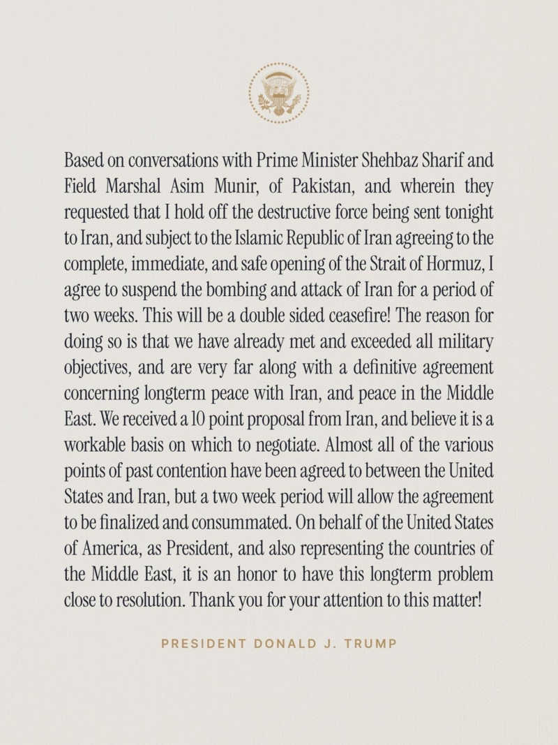 ข้าพเจ้าจึงตกลงที่จะระงับการทิ้งระเบิดและการโจมตีอิหร่านเป็นเวลา 2 สัปดาห์ นี่จะเป็นการหยุดยิง 2 ฝ่าย เหตุผลที่ทำเช่นนี้ก็เพราะเราได้บรรลุและเกินเป้าหมายทางทหารทั้งหมดแล้ว และกำลังดำเนินการไปไกลมากกับข้อตกลงที่ชัดเจนเกี่ยวกับสันติภาพระยะยาวกับอิหร่าน และสันติภาพในตะวันออกกลาง