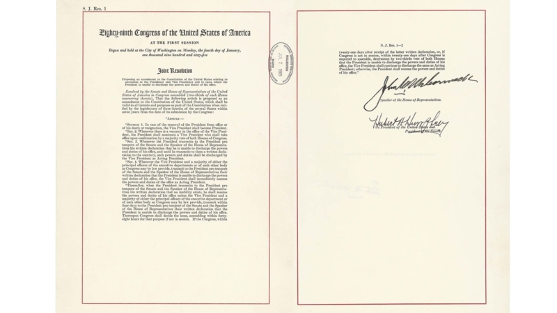 จนกระทั่งสภาคองเกรสผ่านความเห็นชอบในปี 1965 และได้รับการรับรองเป็นบทบัญญัติแก้ไขรัฐธรรมนูญที่ 25 อย่างสมบูรณ์ในวันที่ 10 ก.พ.1967 โดยแบ่งเป็น 4 มาตราที่ชัดเจน เพื่อไม่ให้อำนาจสูงสุดของชาติอยู่ในสภาวะที่ไม่มีใครควบคุมได้อีกต่อไป ได้แก่