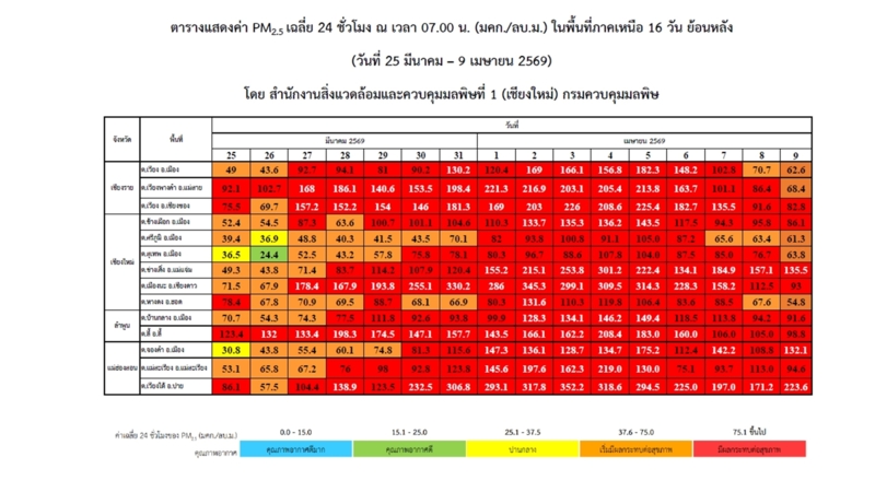 สีแดง (ระดับมีผลกระทบต่อสุขภาพ) ติดต่อกันมา 15 วัน ตั้งแต่วันที่ 25 มี.ค.
