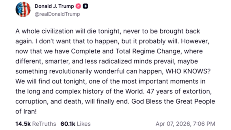 ชนวนเหตุสำคัญเกิดขึ้นจากโพสต์ข้อความของประธานาธิบดีโดนัลด์ ทรัมป์ เมื่อวันอังคารที่ผ่านมา (7 เม.ย.) ระบุว่า "อารยธรรมทั้งมวลจะพินาศสิ้นในคืนนี้" หากอิหร่านไม่ยอมตกลงในข้อเสนอของเขา แม้ว่าในเวลาต่อมาทรัมป์จะประกาศว่าบรรลุข้อตกลงหยุดยิง 2 สัปดาห์ ได้สำเร็จ โดยมีเงื่อนไขการเปิดช่องแคบฮอร์มุซ แต่คำพูดที่รุนแรงและดูเหมือนการข่มขู่จะใช้มาตรการขั้นเด็ดขาด ที่หลายฝ่ายกังวลว่า อาจหมายถึงอาวุธนิวเคลียร์ ได้สร้างความหวาดกลัวไปทั่วสารพัดทิศ