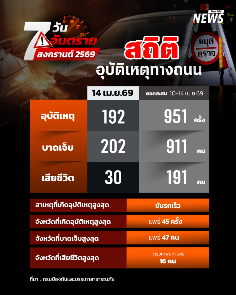ศปถ.สรุปสถิติอุบัติเหตุทางถนนช่วงเทศกาลสงกรานต์ 2569 สะสมในช่วง 5 วัน เกิดอุบัติเหตุรวม 951 ครั้ง ผู้บาดเจ็บรวม 911 คน ผู้เสียชีวิตรวม 191 คน พร้อมสั่งบูรณาการทุกหน่วยงานเตรียมรับมือประชาชนเดินทางกลับ เน้นตรวจความพร้อมรถโดยสารสาธารณะและคนขับเข้มงวดวันนี้ (15 เม.ย.2569) พล.ต.ท.รุทธพล เนาวรัตน์ รมว.ยุติธรรม ในฐานะประธานแถลงข่าวสรุปผลการดำเนินงานของศูนย์อำนวยการป้องกันและลดอุบัติเหตุทางช่วงเทศกาลสงกรานต์ พ.ศ. 2569 (ศปถ.) เปิดเผยว่า ศปถ. ได้รวบรวมสถิติอุบัติเหตุทางถนน ประจำวันที่ 14 เม.ย.2569 ซึ่งเป็นวันที่ห้าของการรณรงค์ "ขับขี่ปลอดภัย ลดความเร็ว ลดอุบัติเหตุ" เกิดอุบัติเหตุ 192 ครั้ง ผู้บาดเจ็บ 202 คน ผู้เสียชีวิต 30 คน