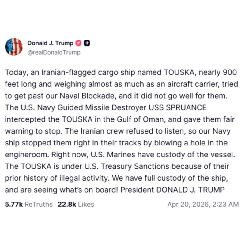 กองทัพเรือสหรัฐฯ ยิงเรือสินค้าอิหร่านกลางน่านน้ำสากล ท่ามกลางบรรยากาศการทูตที่ล้มเหลว เมื่อ "ทรัมป์" ยื่นคำขาดขู่ทำลายโครงสร้างพื้นฐานอิหร่านหากปฏิเสธข้อเสนอสันติภาพ เตหะรานโต้กลับ "เงื่อนไขเพ้อฝัน" ส่อแววเจรจารอบ 2 ล่มวันนี้ (20 เม.ย.2569) วิกฤตการณ์ในตะวันออกกลางที่ดำเนินต่อเนื่องมานานกว่า 50 วัน กำลังก้าวเข้าสู่ภาวะสุ่มเสี่ยงต่อการเกิดสงครามเต็มรูปแบบอีกครั้ง เมื่อ ปธน.โดนัลด์ ทรัมป์ แห่งสหรัฐฯ ได้ประกาศผ่านแพลตฟอร์มทรูธโซเชียล ถึงความสำเร็จของกองทัพเรือสหรัฐฯ ในการเข้ายึดเรือสินค้า "TOUSKA" ติดธงอิหร่าน บริเวณอ่าวโอมาน