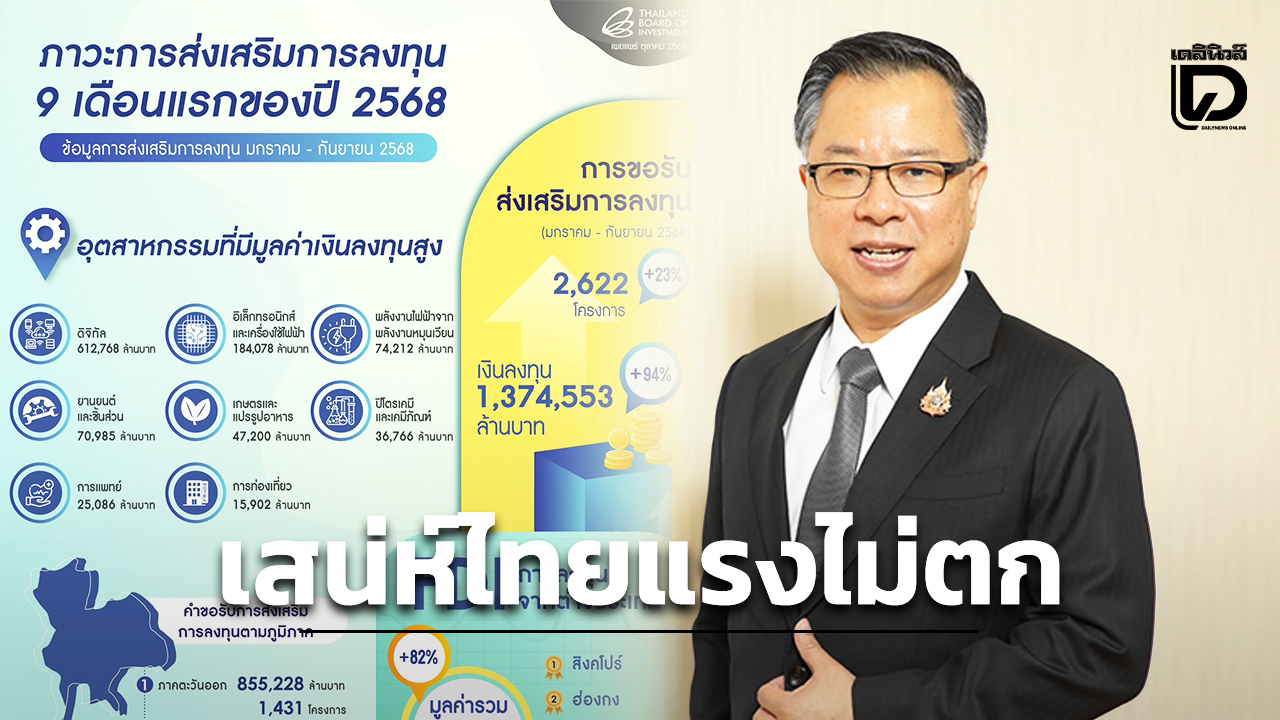 บีโอไอ เปิดยอดขอรับการส่งเสริมการลงทุน 9 เดือน โตเกือบเท่าตัว ทะลุ 1.3 ล้านล้านบาท จากกว่า 2,600 โครงการ นำโดยอุตสาหกรรมดิจิทัล อิเล็กทรอนิกส์ และเครื่องใช้ไฟฟ้า ต่างชาติลงทุนกว่า 9.8 แสนล้านบาท สะท้อนเชื่อมั่นไทยจุดหมายการลงทุนที่สำคัญ ด้วยบรรยากาศการลงทุนที่เปิดกว้าง เป็นกลาง เอื้อต่อความร่วมมือกับพันธมิตรจากทั่วโลก