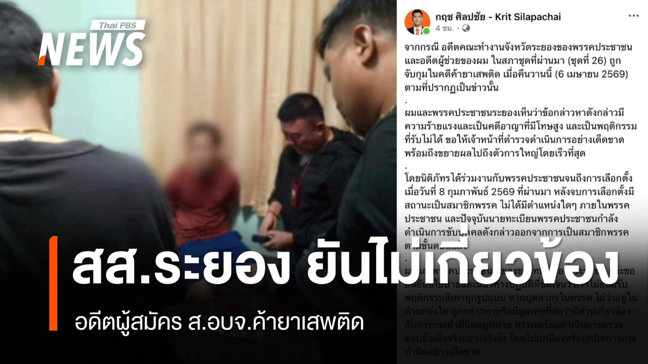 ตำรวจ สภ.เมืองระยอง จับกุมผู้ต้องหาคดียาเสพติด พบเป็นอดีตผู้สมัครสมาชิก อบจ. ขณะที่ สส.ระยอง เขต 2 พรรคประชาชน ยืนยันว่าไม่มีส่วนรู้เห็น ไม่เกี่ยวข้องกับการกระทำของผู้ต้องหา